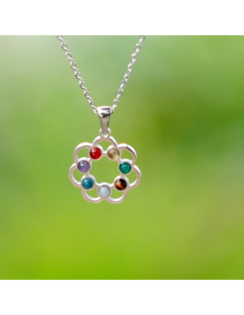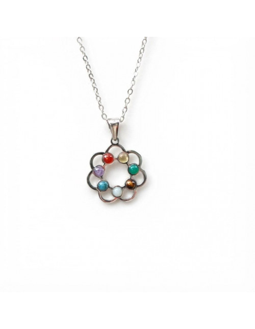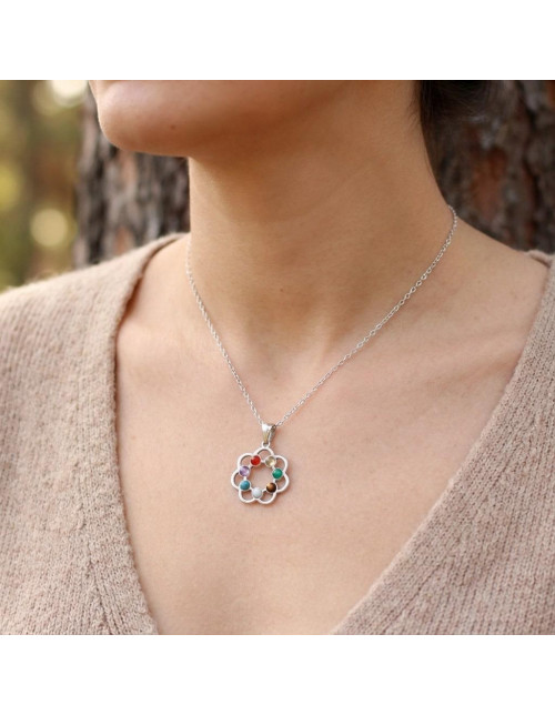 7 farklı doğal taşın enerjisini bir araya getiren Renk Çemberi Çakra Kolye, şık çiçek formu ve renkli taş dizilimiyle hem ruhunuza hem stilinize ışık katar.
